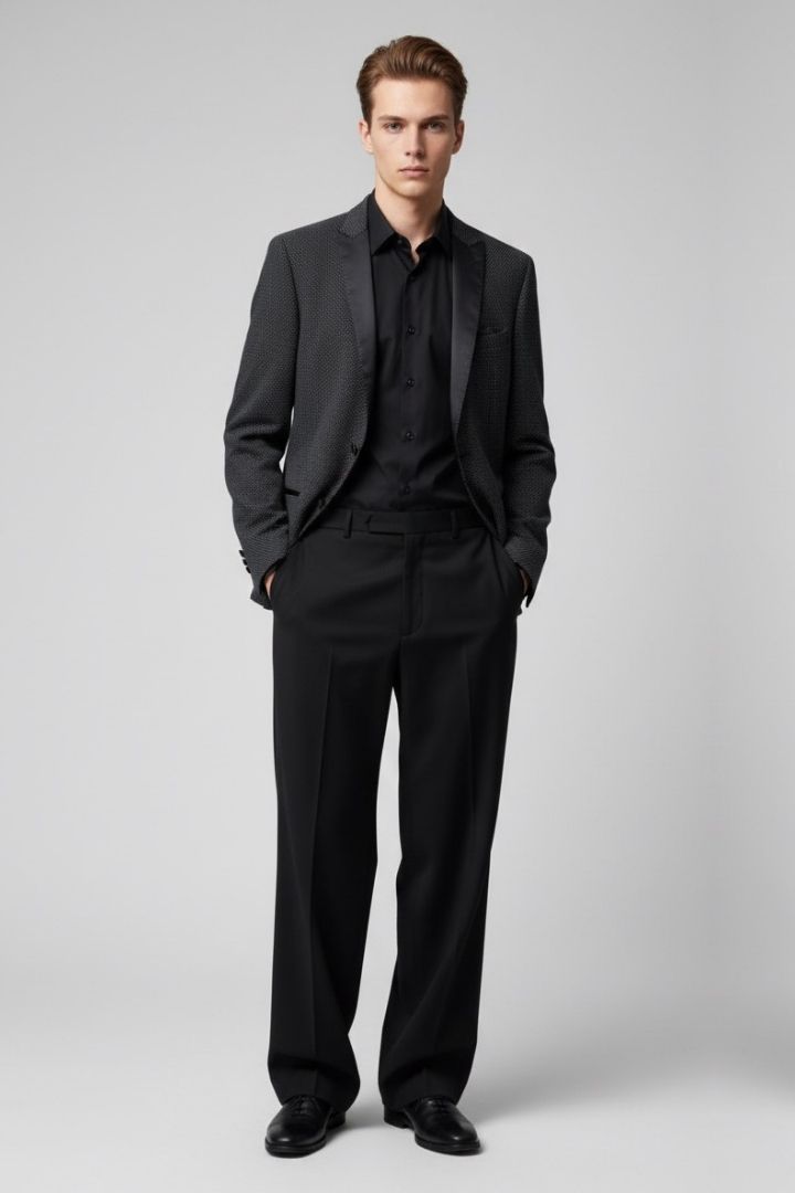 Giacca con rever smoking in raso e tessuto operato