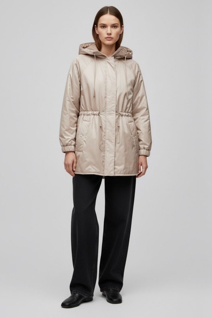 Giacchetto con cappuccio in tessuto imbottito, zip, e coulisse in vita
