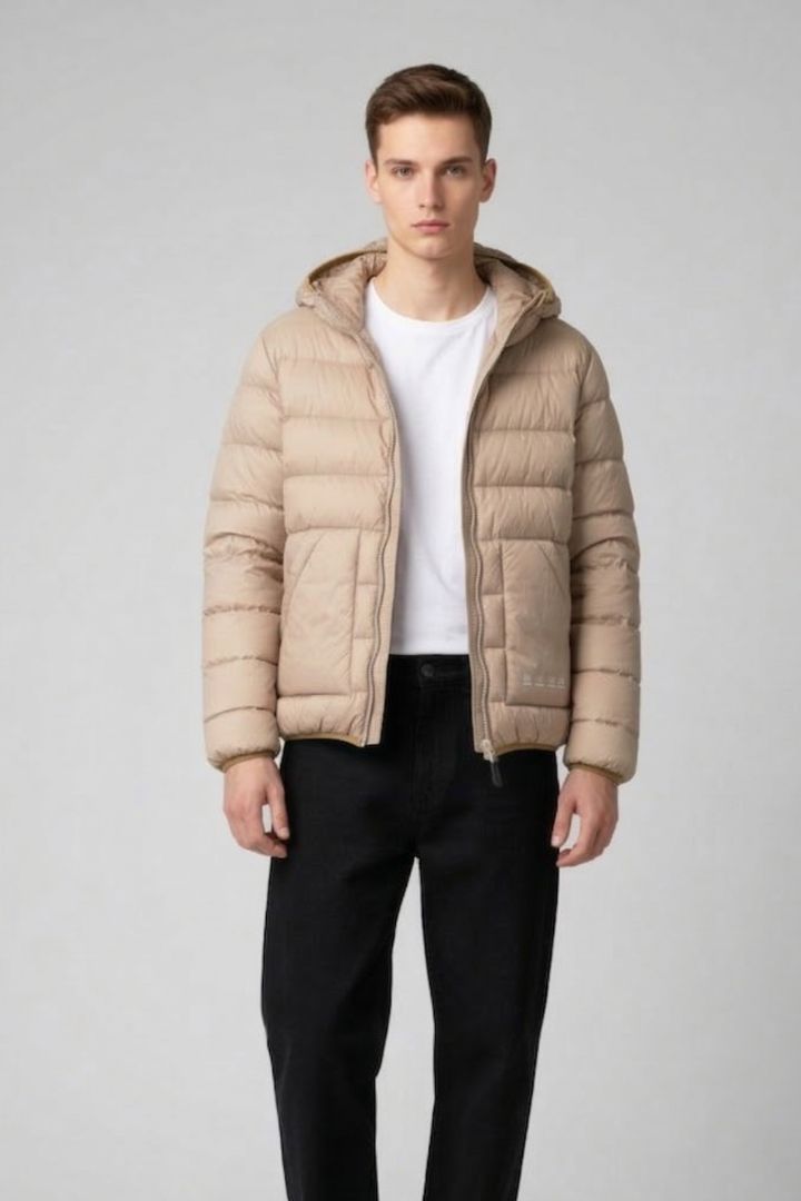 Piumino con cappuccio fisso in tessuto nylon riciclato
