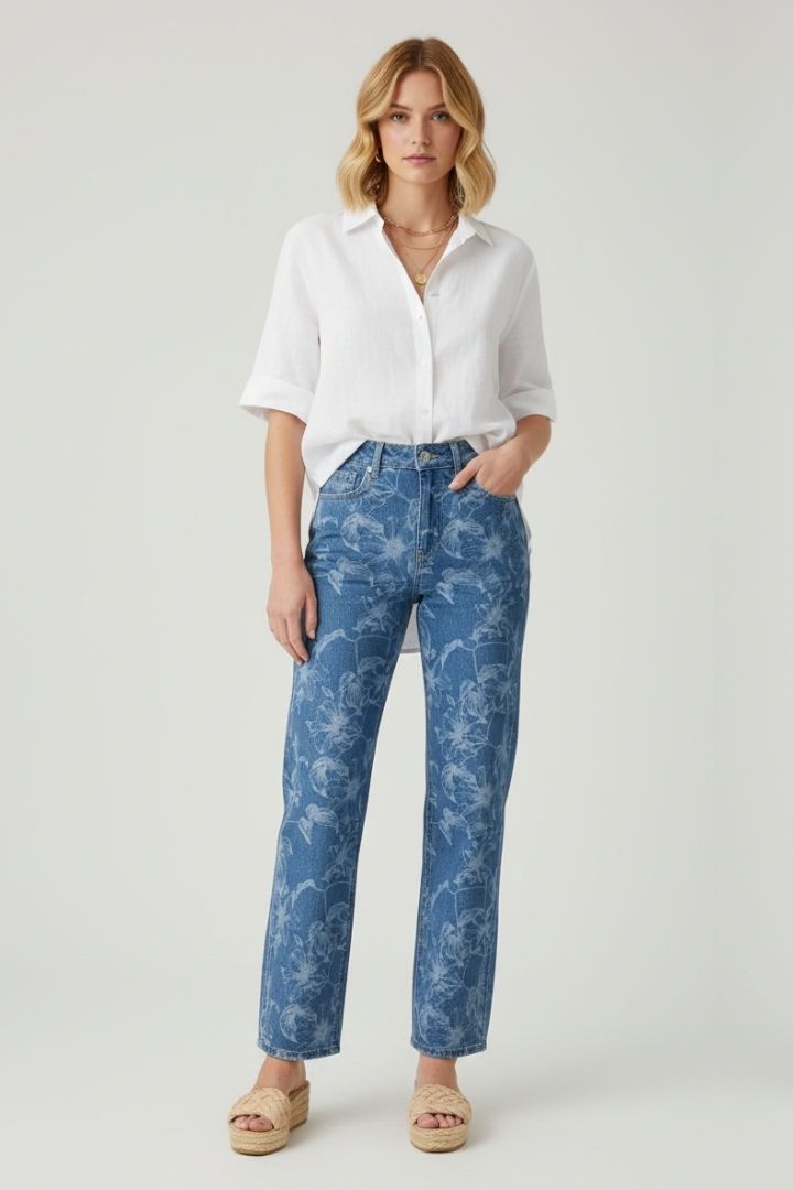 Jeans 5 tasche in tessuto stampato