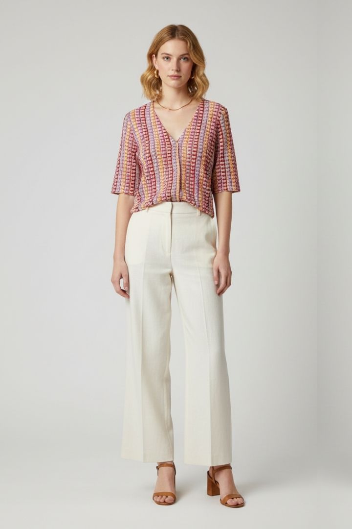 Top a scollo V, in tessuto lavorato multicolor