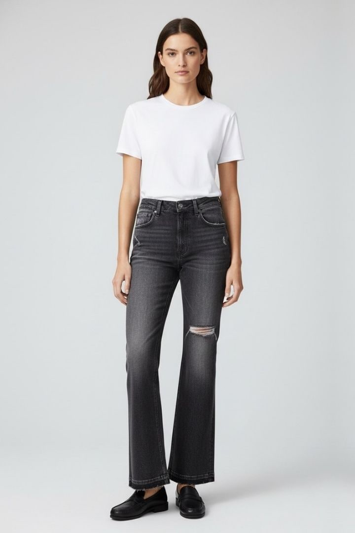 Jeans svasato in fondo con strappo su gamba