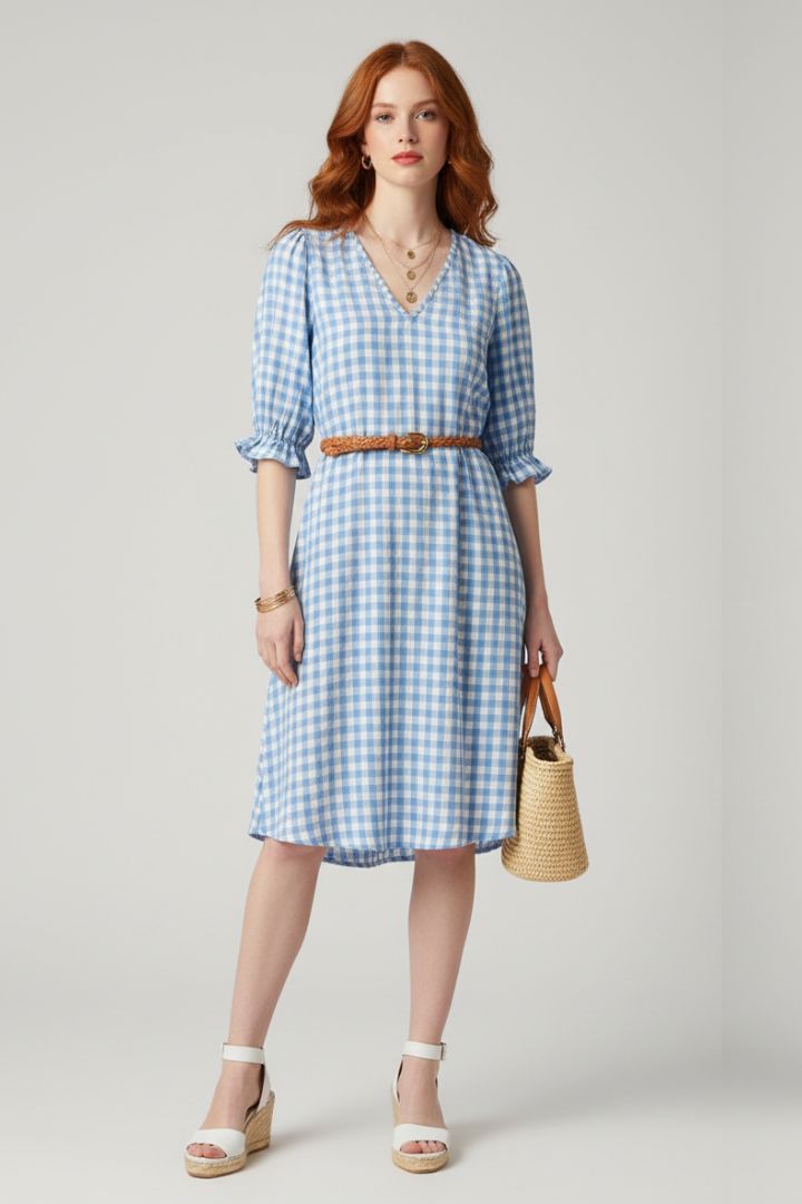 Abito scollo a V mezza manica in fantasia micro quadretto
