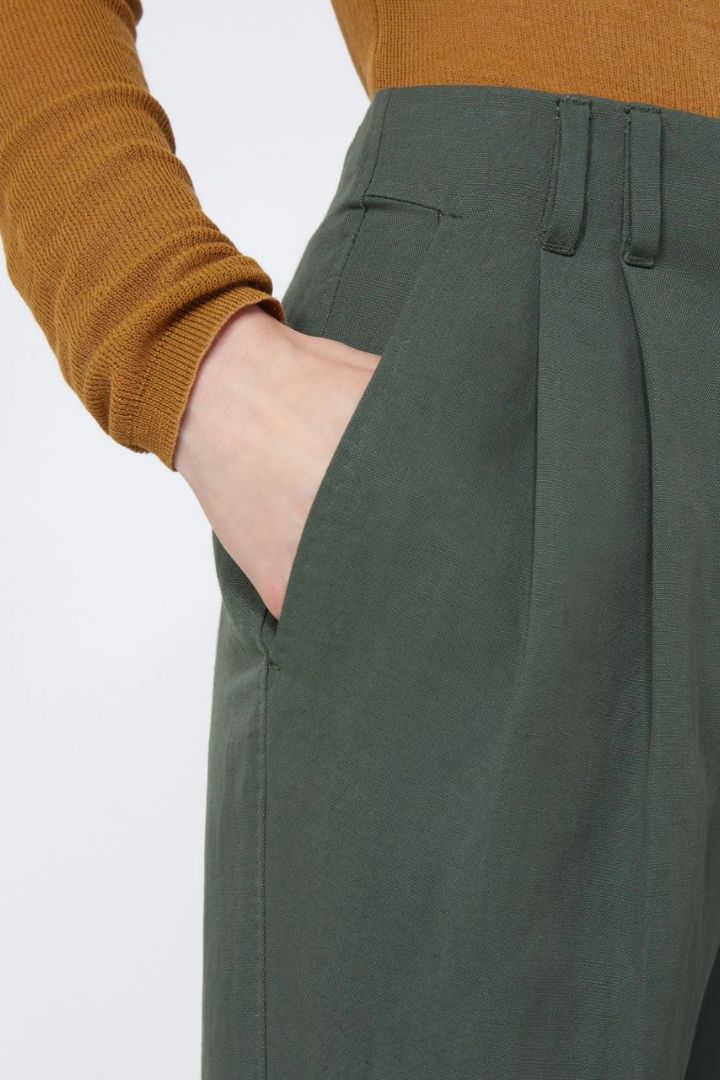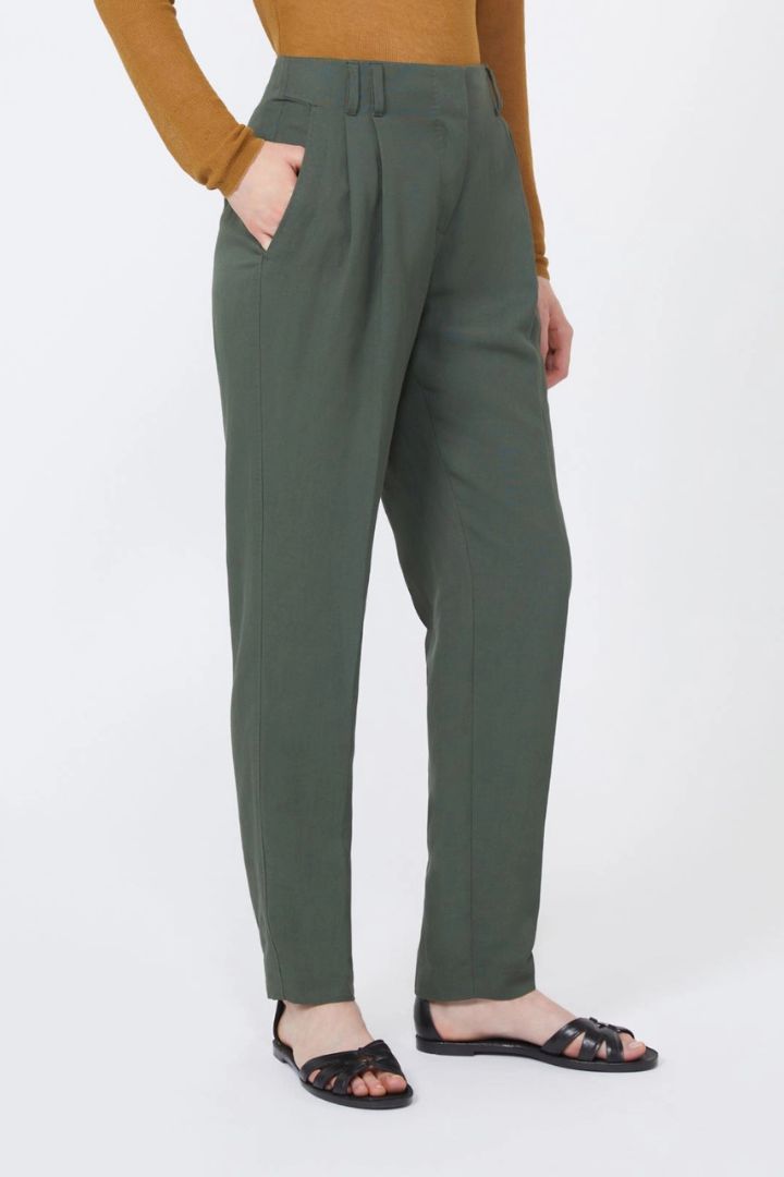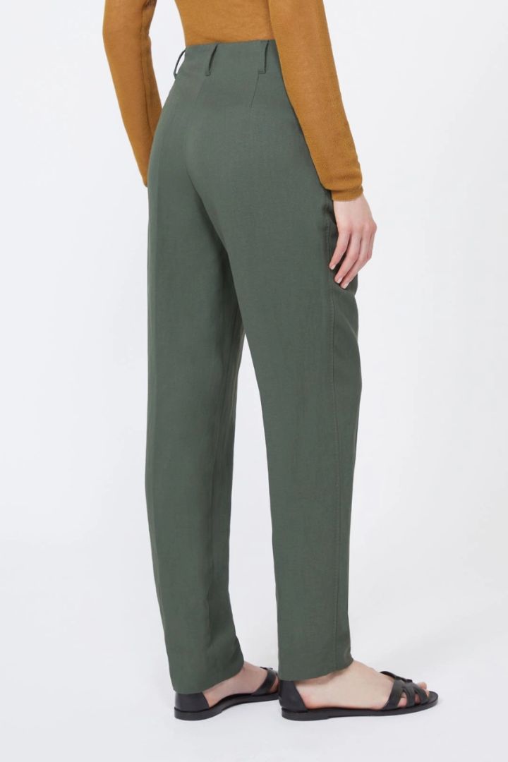 Pantalone caratterizzato da una silhouette carrot, leggermente chiusa al fondo.