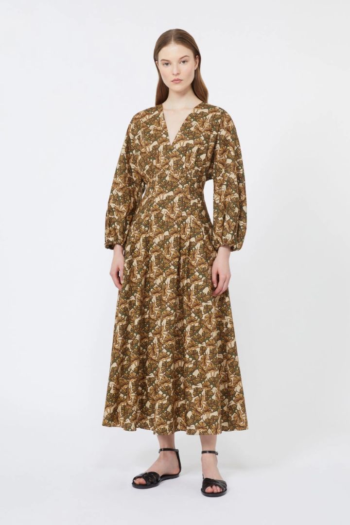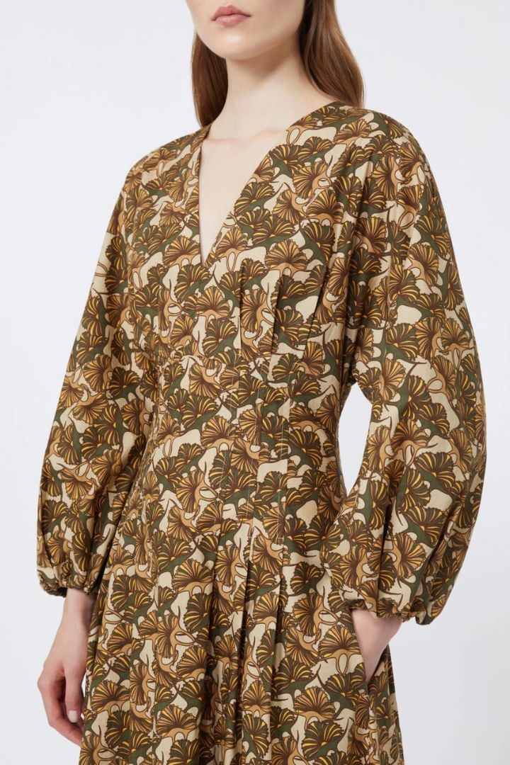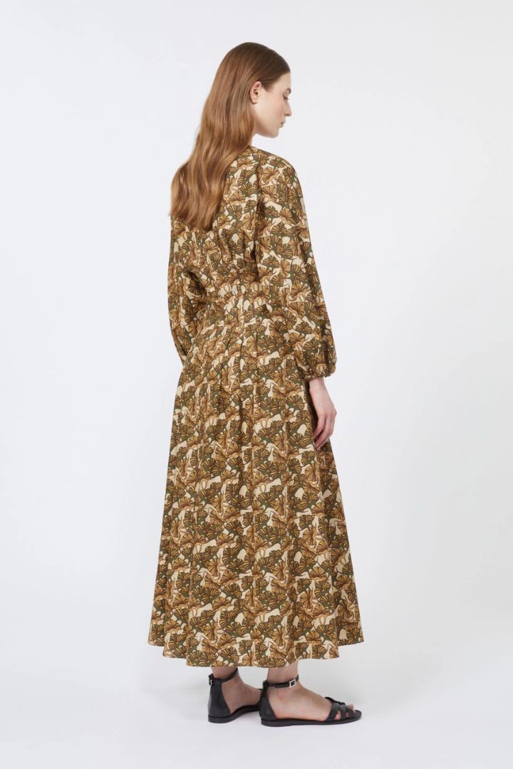 Abito lungo con motivo di collezione stampato all over e scollo a V.