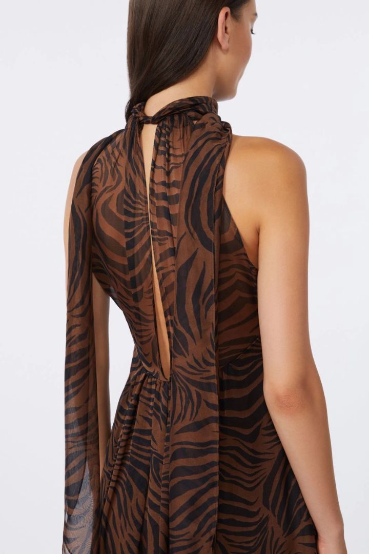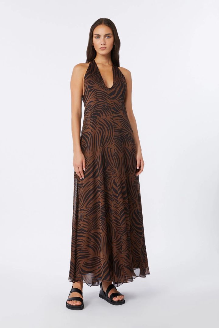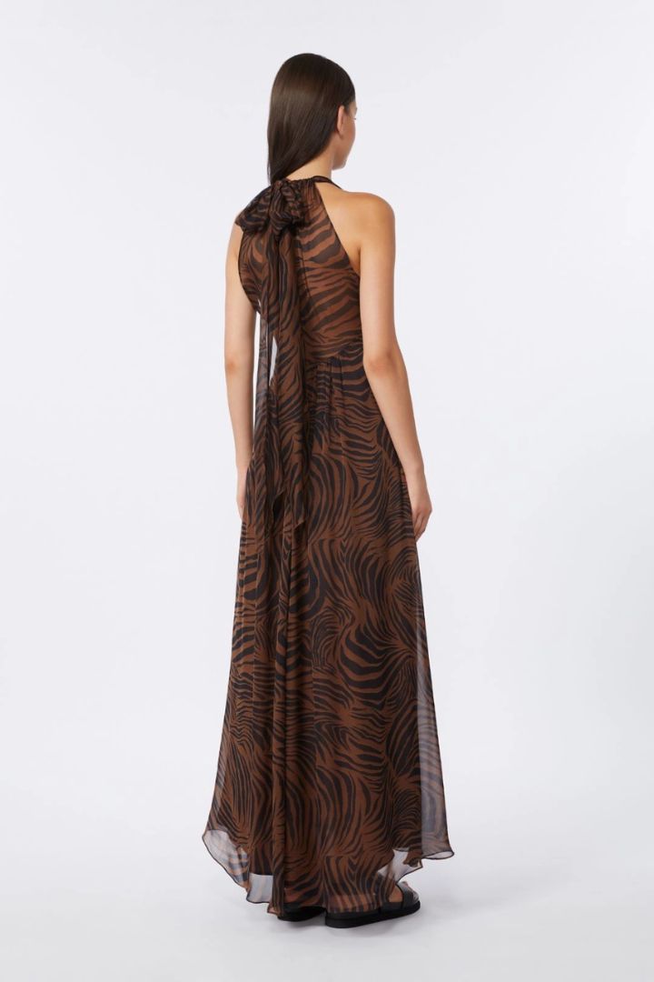 Abito lungo smanicato con motivo di collezione stampato all over.
