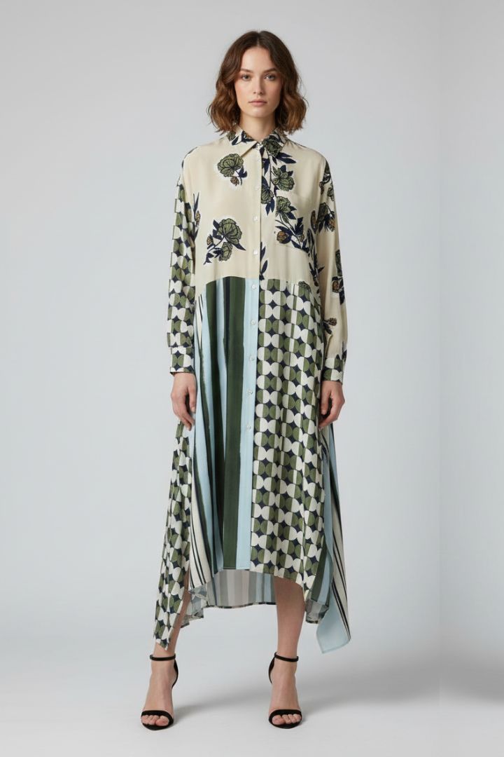 Abito chemisier in stampa fantasia con fondo asimmetrico