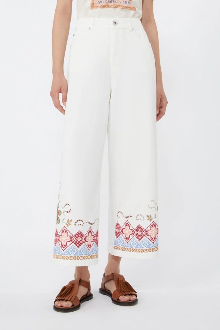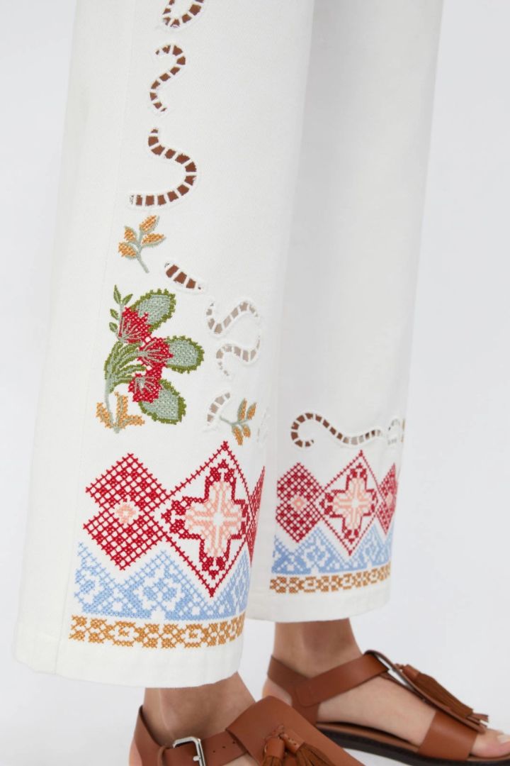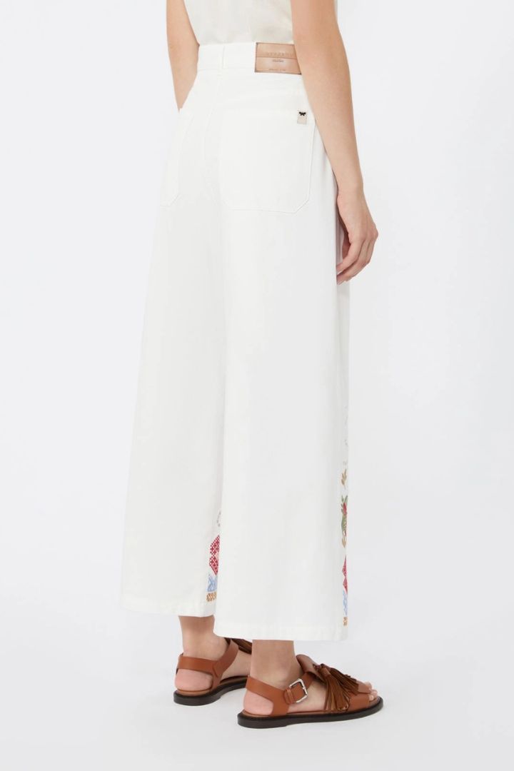 Pantalone cropped 5 tasche, decorato con ricami al fondo sul davanti.