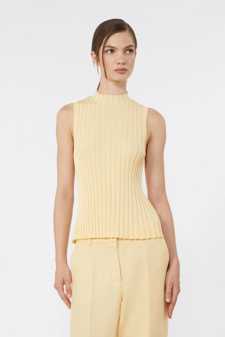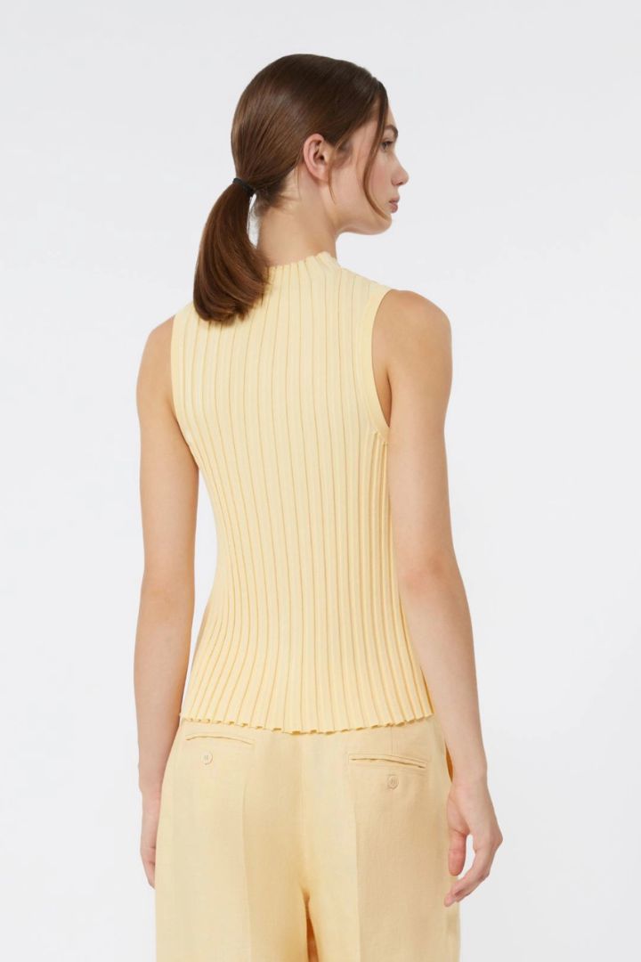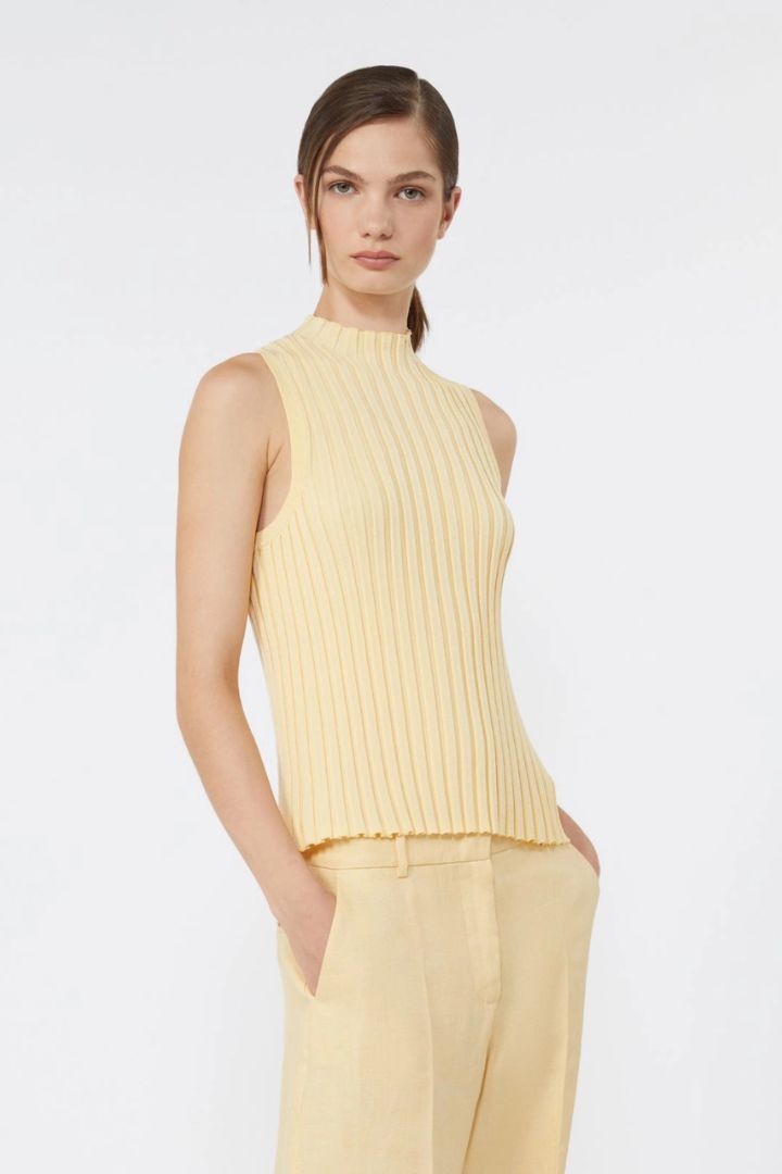 Maglia smanicata, caratterizzata da una lavorazione a coste che evidenzia la silhouette.