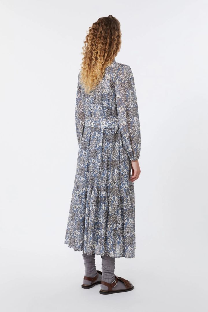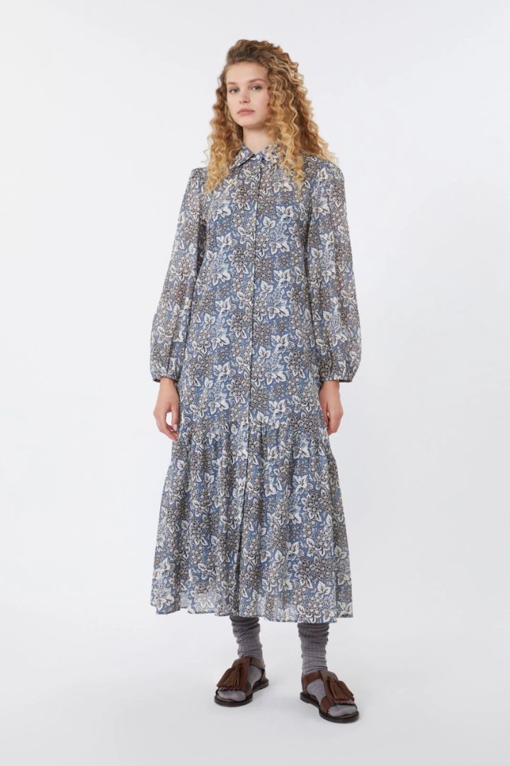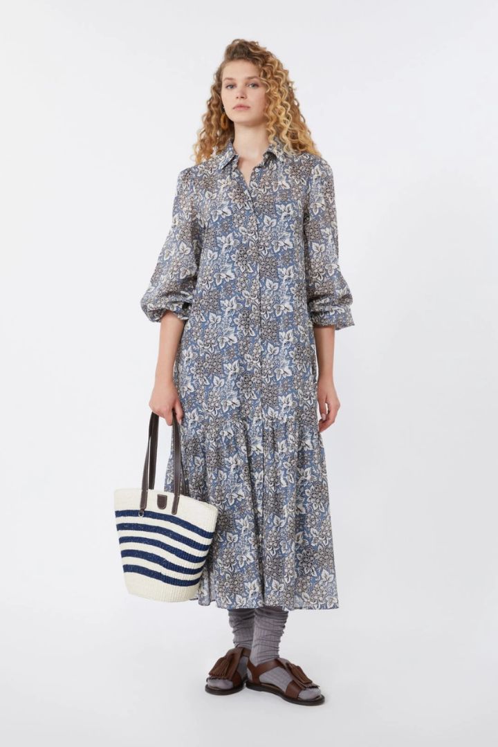 Abito chemisier lungo dalla linea fluida, con cintura abbinata in vita e motivo di collezione stampato all over