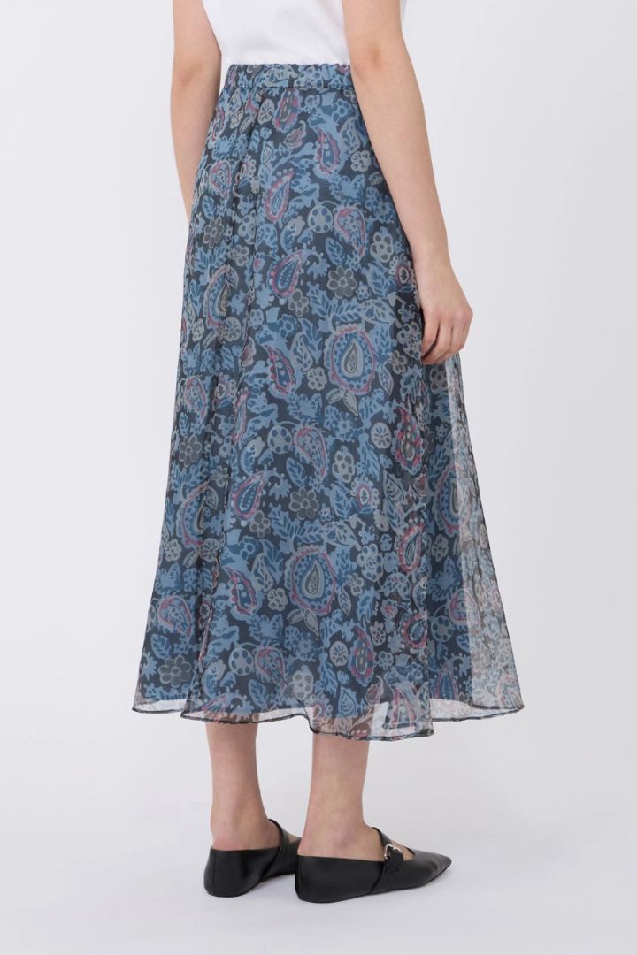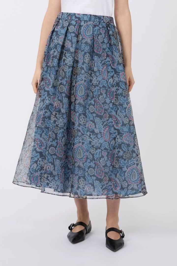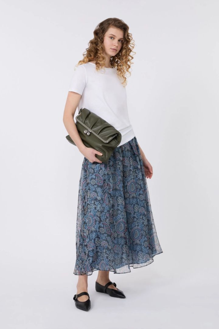 Gonna lunga con motivo di collezione stampato all over e pieghe sul davanti.