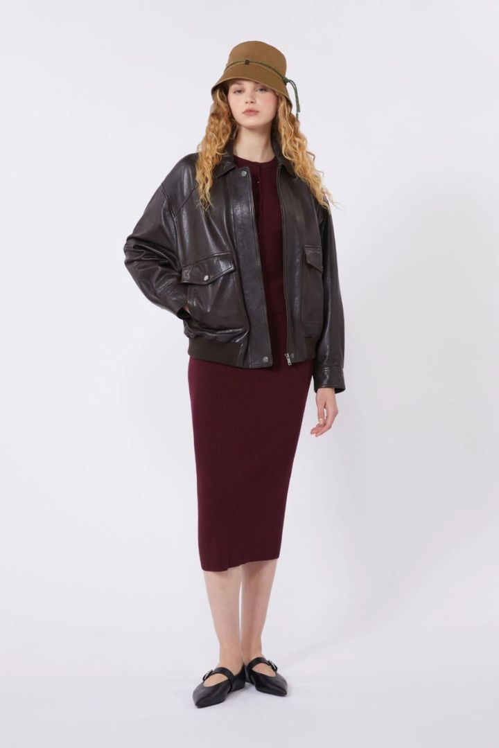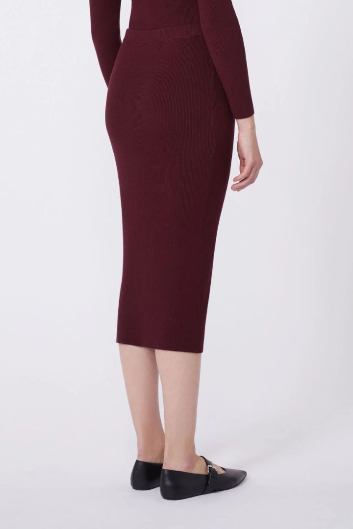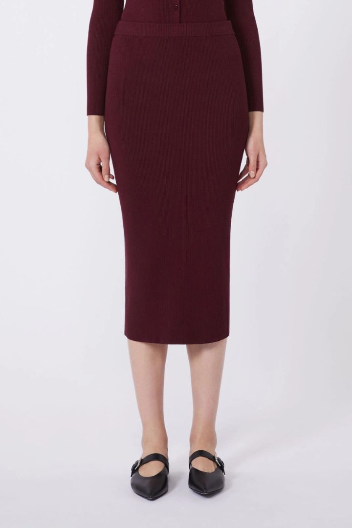 Gonna midi a tubino, caratterizzata da una lavorazione a coste che evidenzia la silhouette.