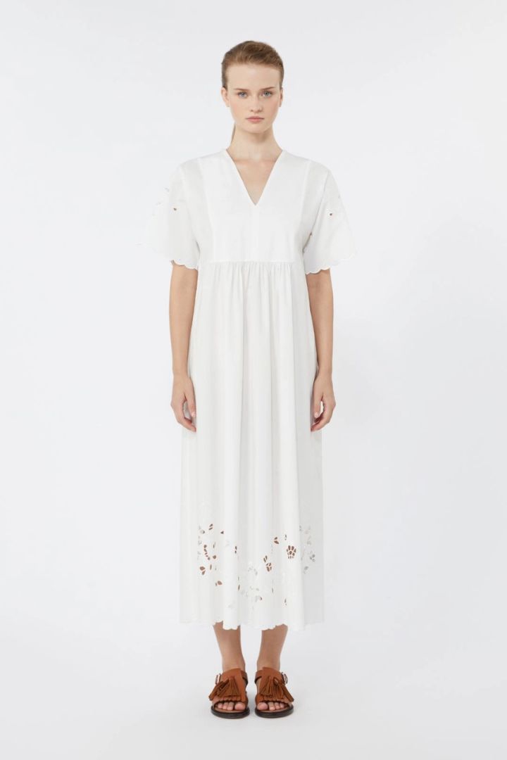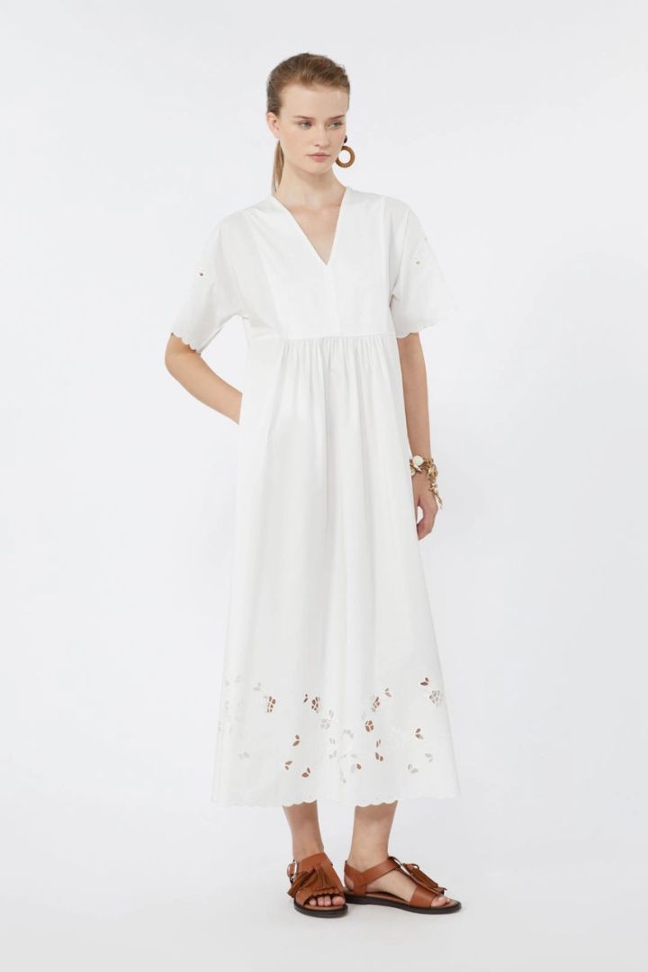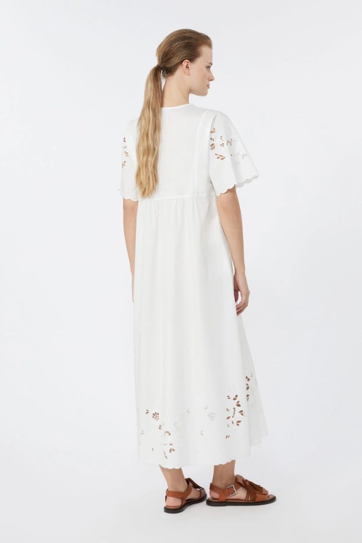 Abito lungo dalla linea ampia, impreziosito da ricami Sangallo e inserti in jersey effetto plastron davanti e sul retro.